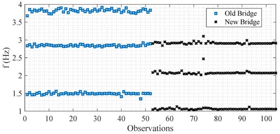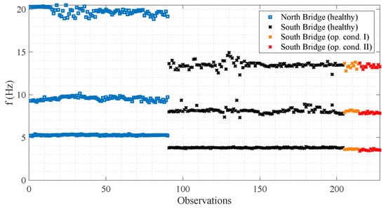 Each observation comprised the first three natural frequencies at a given time. Figure 4 shows both bridges’ first three natural frequencies in concatenated format. For the north bridge, there were 90 observations from the healthy condition. On the other hand, for the south bridge, there were 114, 10, and 14 observations, respectively, for the healthy condition, operational condition I, and operational condition II, respectively.