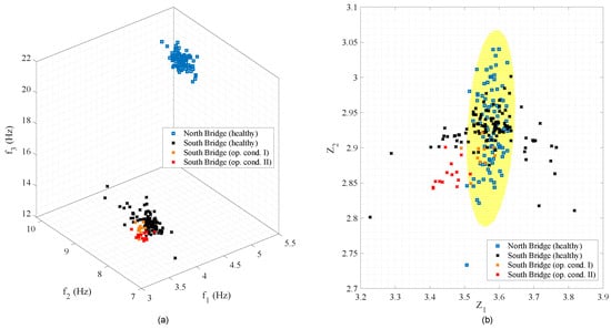Figure 5a shows all observations from both bridges in the original feature space. The slight differences in the bridges’ structures result in the mismatch of the centroids of the observations for the healthy condition.