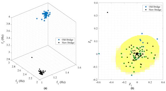 Pedestrian bridges: (a) observations in the original 3D feature space; (b) observations mapped onto the latent 2D feature space, with the decision boundary defined for a level of significance of 5% in the form of a yellow ellipse.