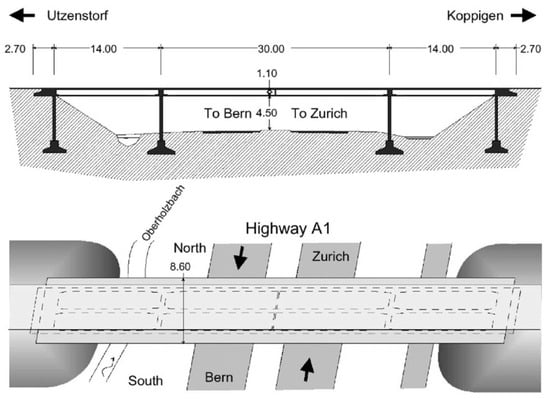 The Z−24 Bridge (Figure 9) was a post-tensioned concrete box girder bridge split into one central span of 30 m and two side spans of 14 m, as illustrated in Figure 10. A monitoring system was installed in the bridge and several experiments were extensively carried out before its demolition to provide a comprehensive “feasible tool” for vibration-based SHM in bridge engineering [].