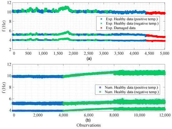 (a) Experimental observations and (b) numerical observations from the Z−24 Bridge composed of the first three natural frequencies.