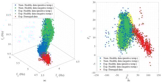 Figure 13a shows the observations in the original 3D feature space. Even though the numerical modeling shows an increase in the natural frequencies due to the influence of temperature on the dynamic behavior of the bridge, the experimental and numerical natural frequencies present some divergences. As shown in Table 3, the differences in the first three natural frequencies (, , and ) may not be significant for structural analysis, but it may challenge the application of numerical data to train a classifier, as shown in [].