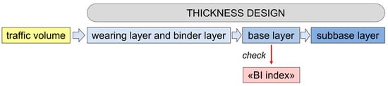 Such a design procedure initially considers the number of equivalent 10-ton axles corresponding to the Average Annual Daily Traffic of Heavy vehicles (AADTH) anticipated for the road lifespan. The material types and thicknesses of the wearing and binder layers are directly decided considering the traffic volume, whereas the thickness of the base layer is designed based on the chosen construction material. The wearing, binder, and base courses are then assigned “load distribution coefficients” (“lastfordelingskoeffisienter” in Norwegian), which are used to appraise the corresponding “base layer index” (“bærelagindeks”) (BI), assessed against a minimum threshold (BImin). Eventually, the subbase course is designed based on the subgrade type.