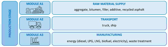 From an LCA perspective, the life cycle of a road pavement can be broken down into four stages, which are further subdivided into modules: the production stage (A1–A3), the construction stage (A4–A5), the use stage (B1–B7), and the end-of-life stage (C1–C4) [,]. This study only focuses on the carbon dioxide emissions released during the production stage of road construction materials, namely aggregates and AC, as described in Section 1. The three corresponding modules A1, A2, and A3 deal with raw material supply, transport, and manufacturing, respectively (Figure 2).