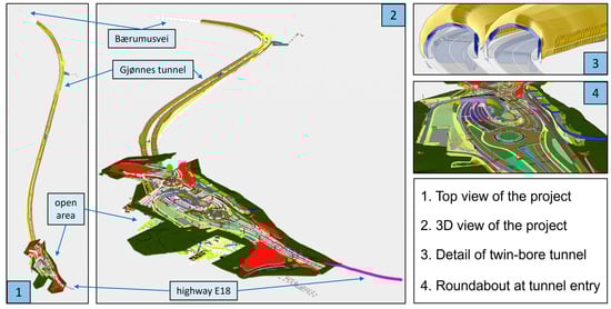 - NPRA. Gjønnestunnelen—Entreprise E105. 2024. Available online: https://www.vegvesen.no/vegprosjekter/europaveg/e18vestkorridoren/lysaker-ramstadsletta/gjonnestunnelen---e105/ (accessed on 1 June 2024).
