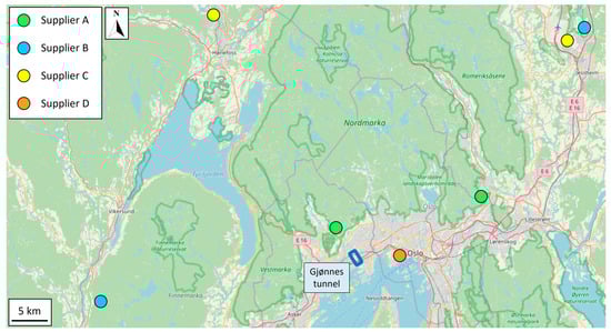 This study appraises the carbon budget related to the production of road construction materials. In this regard, the four main industrial suppliers operating in the greater Oslo region are considered (Figure 5), namely NCC, Peab, Veidekke, and Velde, which are denominated as Supplier A, Supplier B, Supplier C, and Supplier D, respectively.