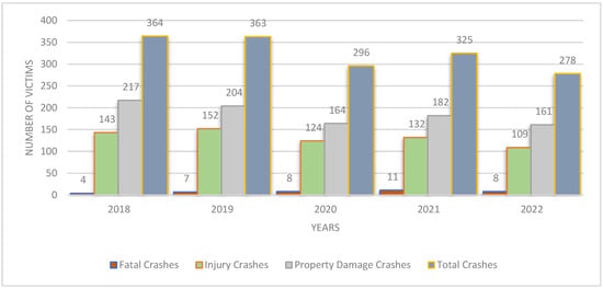 From 2018 to 2022, observed according to the type of road crash, the highest percentage of road crashes that occurred at railroad crossings were “crashes involving a rail and road vehicle” (21.79%), followed by “crashes involving a single vehicle and obstacles on or above the road” (24.83%) [].
