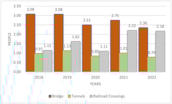 Figure 5 illustrates the total number of road crashes per kilometer at characteristic infrastructural locations from 2018 to 2022. It can be concluded that the highest number of road crashes per kilometer occurs on bridges, followed by railroad crossings, and the lowest occurs in tunnels. A similar pattern is observed in the number of fatalities per kilometer, the number of injuries per kilometer, and the number of road crashes with material damage per kilometer for the period from 2018 to 2022. Table 1 shows the above data.