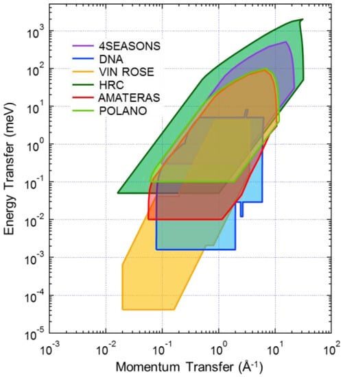 The MLF Spectroscopy Group consists of six instruments for inelastic and quasi-elastic neutron scattering in MLF [38]. 4SEASONS, HRC, AMATERAS, and POLANO are direct geometry spectrometers; 4SEASONS, HRC, and POLANO use Fermi choppers to monochromate incident neutron beams, while AMATERAS used a combination of disk choppers. Among these spectrometers, POLANO can be used with polarized neutrons. Its construction was completed recently, and it has been in the commissioning phase since 2017. DNA is a near-back scattering spectrometer with a pulse-shaping chopper. Measurements with micro-eV resolution can be performed using this instrument. Neutron spin echo (NSE) spectrometer VIN ROSE can access even slower dynamics. This spectrometer includes two instruments of the Modulated Intensity with Zero Effort (MIEZE) type and Neutron Resonance Spin Echo (NRSE) type. They are under commissioning and are expected to be open to the user program in 2017. Combinations of these instruments in MLF allows for the study of dynamics in diverse fields, including solid state physics, amorphous materials and liquids, soft and biological matters, as well as industrial applications such as tire rubbers and battery materials (Figure 2).