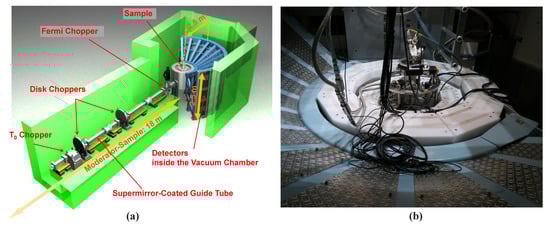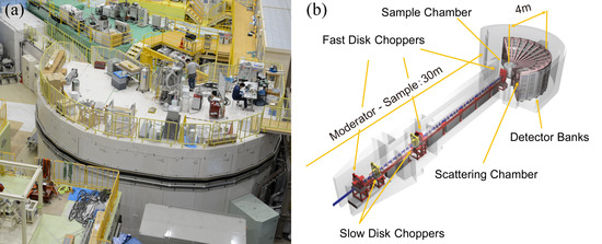 4SEASONS is a thermal neutron Fermi chopper spectrometer designed for measurements of dynamics in the 100–102 meV energy range [14,38]. A schematic view of 4SEASONS is presented in Figure 3a. Characteristic parameters of the spectrometer are listed in Table 2. It is installed at BL01 beam port for viewing the coupled moderator. Neutrons are transported to a sample position located 18 m downstream of the moderator through an elliptically converging straight neutron guide tube coated with supermirrors [39]. The incident neutrons are monochromated by a fast-rotating Fermi chopper positioned 1.7 m upstream of the sample position. In addition, the instrument has a T0 chopper for suppressing fast neutrons and two disk choppers for band definition. Neutrons scattered by a sample are detected over time by the one-dimensional (1D) 3He position-sensitive detectors (PSDs) placed at 2.5 m from the sample position. The angular coverage of the detectors relative to the direct beam ranges from −35° to +91° horizontally and from −25° to +27° vertically. The sample environment devices and detectors are enclosed in a large vacuum chamber without any window separating them, which minimizes background scattering and detector gaps (Figure 3b). To further reduce the background scattering from the sample environment, an oscillating radial collimator is available [40].