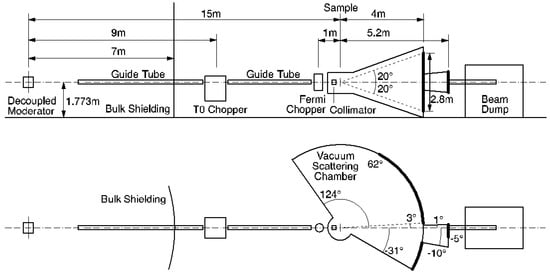 The High Resolution Chopper Spectrometer (HRC) offers high resolutions and delivers relatively high-energy neutrons for a wide range of studies on the dynamics of materials [13,15,16]: the range of incident neutron energies Ei = 5–2000 meV is available, and especially, by using Ei ≤ 300 meV, energy resolution of ΔE/Ei = 2% can be achieved in the best case. For conventional experiments, the energy resolution is set to ∆E/Ei = 3–10% to increase the neutron flux. A schematic layout of HRC is illustrated in Figure 5, and the characteristic parameters are listed in Table 3. On the primary flight path of 15 m, a supermirror guide, T0 chopper running up to 100 Hz at 9 m from the neutron source, Fermi chopper at 14 m from the source, and an incident beam collimator system just at the upper stream of the sample are installed. HRC has a detector array of 3He PSDs measuring 2.8 m in length and 19 mm in diameter at 4 m from the sample position, and it covers scattering angles from 3° to 62° for conventional experiments. Moreover, another array of 3He PSDs measuring 0.8 m in length and 12.7 mm in diameter is installed at 5.2 m from the sample position, and it covers scattering angles down to 0.6°. The incident beam collimator system having two collimators composed of slits of vertical sheets of Cd is installed for reducing background noise and one of the two collimators is selected: coarse collimation of 1.5° for conventional experiments using detectors down to 3° and fine collimation of 0.3° for low-angle experiments using detectors down to 0.6°.