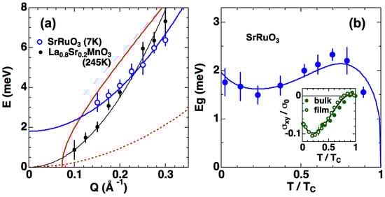 (a) Spin wave dispersion relationships of SrRuO3 (T = 7 K) and La0.8Sr0.2MnO3 (T = 245 K) observed with NBS at HRC [13]. The black line is a single-crystal result, and the blue line is a fitted curve with E(Q) = DQ2 + Eg. The accessible energy-momentum space in this experiment is below the red line, which is the scan locus of a detector at the scattering angle ϕ = 0.6° with Ei = 100 meV, and the red dotted line is the upper limit of the accessible space for ϕ ≥ 5°; (b) Eg(T) of SrRuO3 [57]. The blue line is a theoretical curve (see text). The inset shows σxy(T) for bulk and film samples, where σ0 is a constant, and the solid line is an empirical function describing σxy(T) for the analysis of Eg(T).