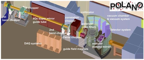 Schematic POLANO beamline and instruments. Neutron beam coming from left-hand side is injected into vacuum chamber (sample) [38].