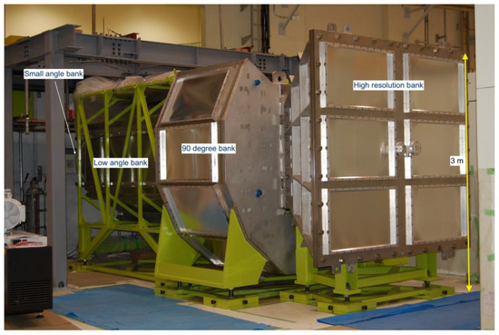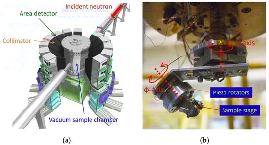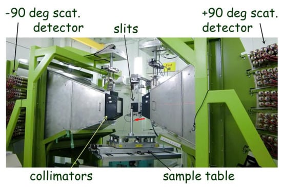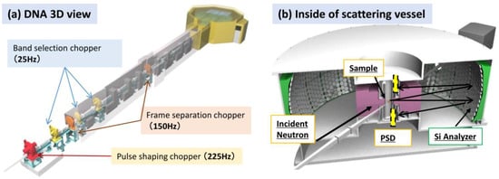 Two visual representations (a three-dimensional (3D) view and an inside view of the scattering vessel) of DNA are shown in Figure 9a,b. The characteristic parameters are listed in Table 6. The Si-111 crystal analyzers, the first key device for DNA, installed in the vacuum vessel cover scattering angles ranging from −30° degrees to +150° in the horizontal plane and from +21° to −14° in the vertical plane (Figure 9b). The measurable momentum range is Q = 0.08–1.86 Å−1. The analyzer spherical surface is divided into the upper and the lower parts centered at different positions 102 mm upward and downward of the scattering center (sample position), respectively. Neutrons scattered by the sample are energy-analyzed under the near-back-scattering condition with Bragg angle θB ~ 87.5° and then countered by position-sensitive 3He gas detectors (PSDs) arranged on the circumference of the same scattering center and shifted upward and downward (Figure 9b). These arrangements of the analyzer units and the detectors allow us to angle-resolve scattered neutrons in the horizontal and the vertical directions two-dimensionally, and therefore, this spectrometer has the potential for use in experiments involving single crystalline samples.