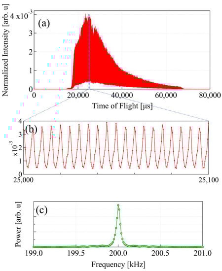 (a) Measured time-of-flight (TOF)-MIEZE signal with an effective frequency of 200 kHz; (b) TOF-MIEZE signal between 25 and 25.1 ms, and (c) power spectrum of TOF-MIEZE signal by Fourier transformation.