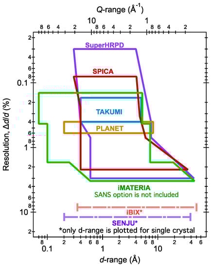 - Crystal-structure group (diffractometers)SuperHRPD: Super High-Resolution Powder Diffractometer [21]SPICA: Special Environment Powder Diffractometer [22]iMATERIA: IBARAKI Materials Design Diffractometer (Versatile Neutron Diffractometer) [23]PLANET: High-Pressure Neutron Diffractometer [24]TAKUMI: E Engineering Materials Diffractometer [25,26]iBIX: IBARAKI Biological Crystal Diffractometer [27,28]SENJU: Extreme Environment Single-crystal Neutron Diffractometer [29].