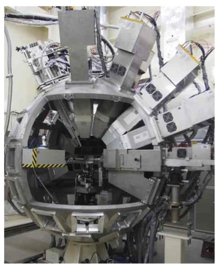 - Kawasaki, T.; Nakamura, T.; Toh, K.; Hosoya, T.; Oikawa, K.; Ohhara, T.; Kiyanagi, R.; Ebine, M.; Birumachi, A.; Sakasai, K.; et al. Detector system of the SENJU single-crystal time-of-flight neutron diffractometer at J-PARC/MLF. Nucl. Instrum. Methods Phys. Res. Sect. A 2014, 735, 444. [Google Scholar] [CrossRef]