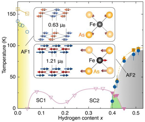 - Hiraishi, M.; Iimura, S.; Kojima, K.M.; Yamaura, J.; Hiraka, H.; Ikeda, K.; Miao, P.; Ishikawa, Y.; Torii, S.; Miyazaki, M.; et al. Bipartite magnetic parent phases in the iron oxypnictide superconductor. Nat. Phys. 2014, 10, 300–303. [Google Scholar] [CrossRef]