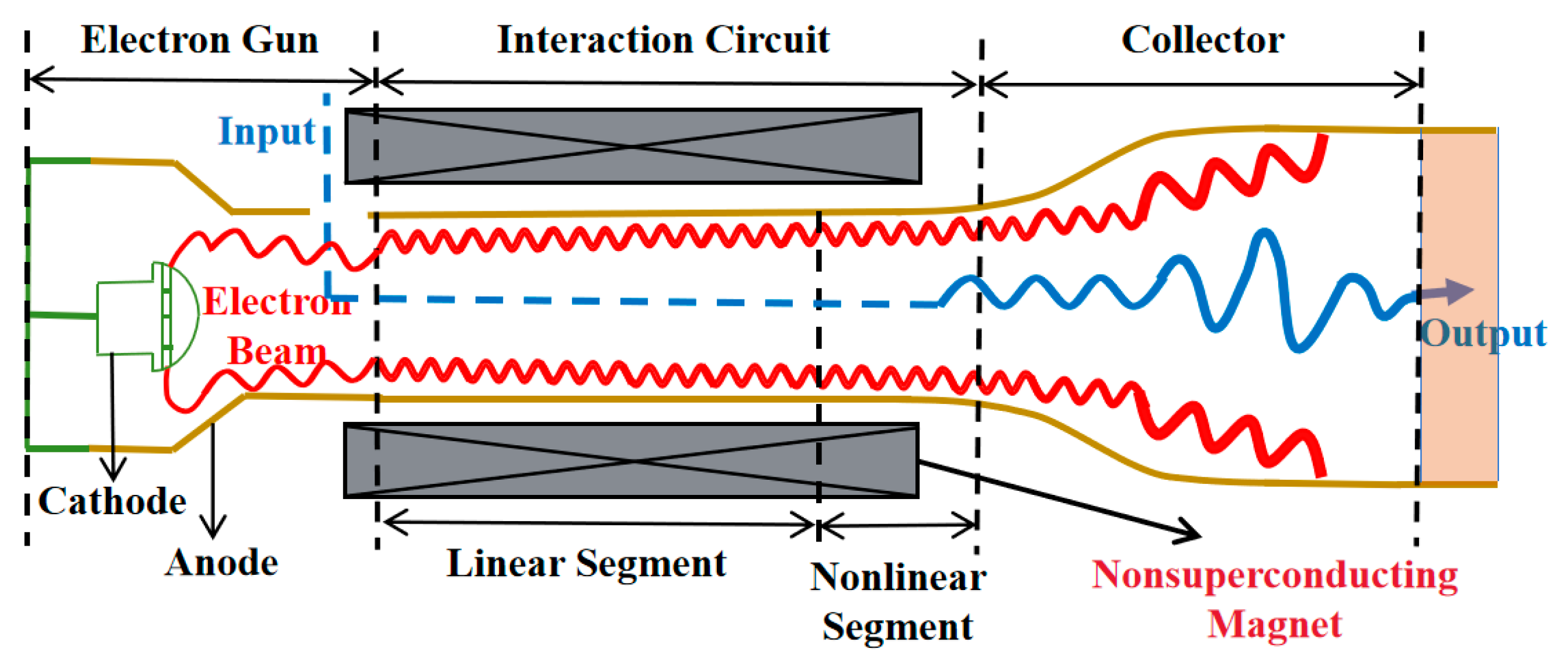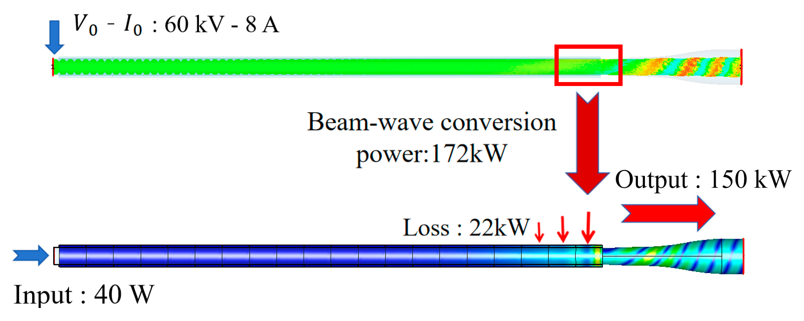 - Jintao, Y.; Efeng, W.; Chaojun, L.; Qixiang, Z.; Jinjun, F.; Zihan, L.; Xu, Z. Research on a Ka-band large-orbit gyro-TWT with periodic dielectric-loaded structure. Electron. Lett. 2023, 60, e13068. [Google Scholar] [CrossRef]
