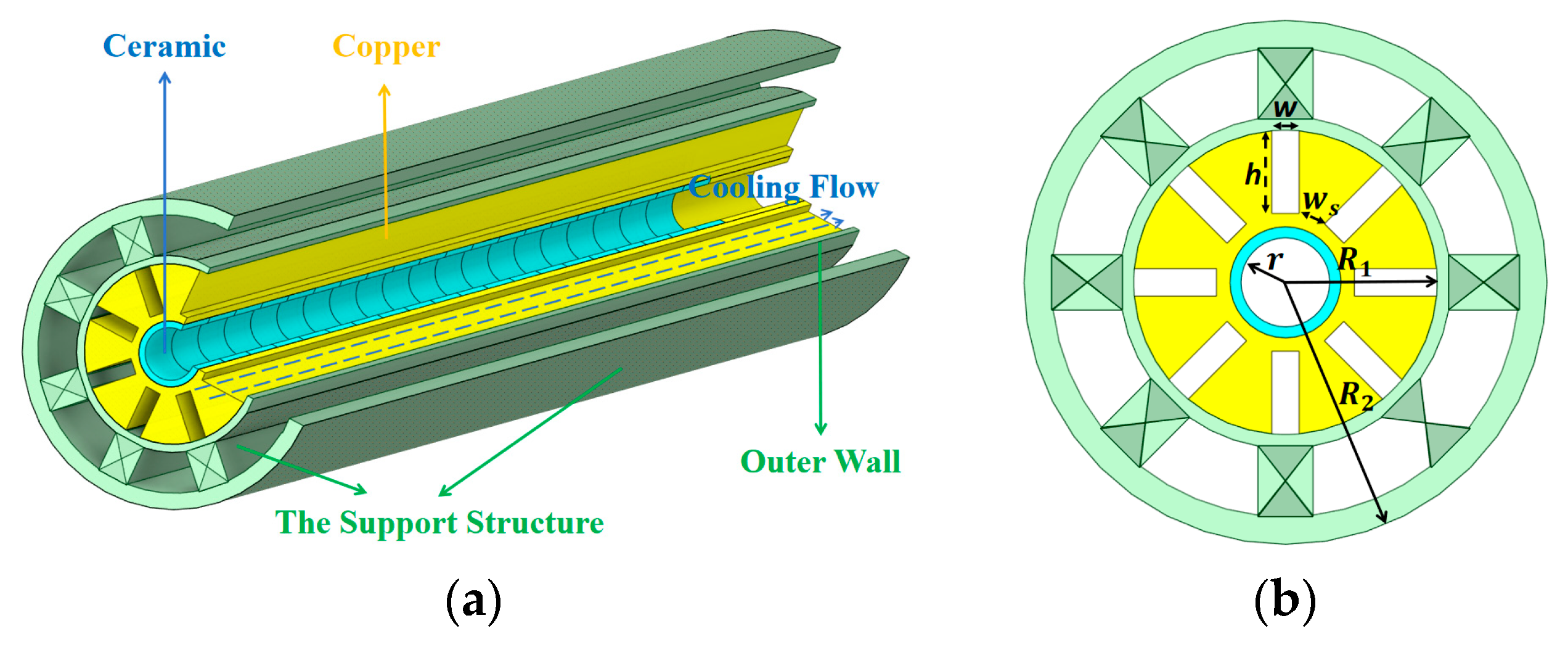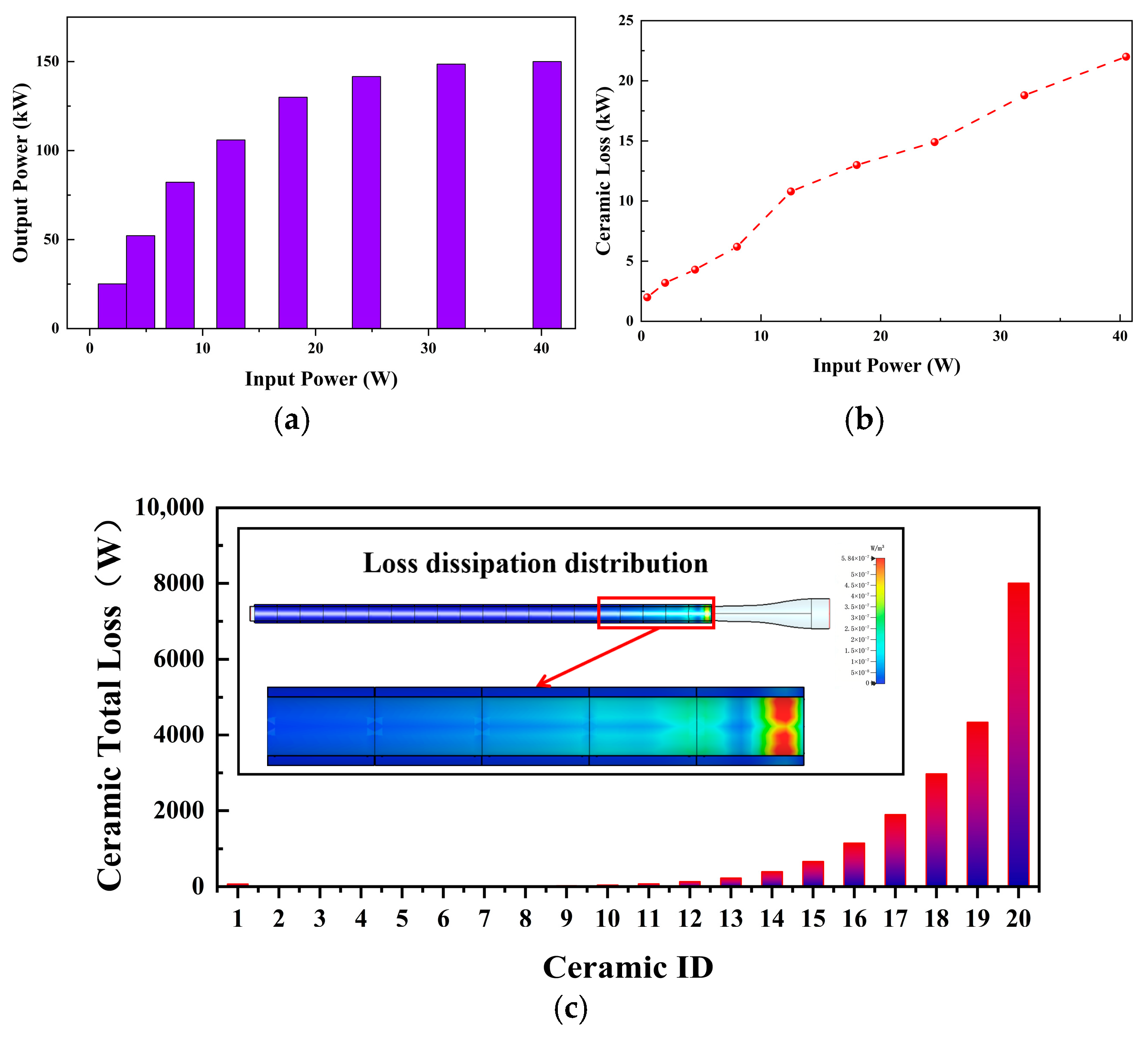 - Jiang, W.; Dai, B.; Lu, C.; Liu, G.; Wang, J.; Pu, Y.; Luo, Y. High Average Power Investigation of Dielectric Dissipation in the W-Band Gyro-TWT. IEEE Trans. Electron Devices 2022, 69, 3926–3932. [Google Scholar] [CrossRef]