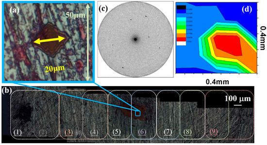 Figure 1a shows the center point for mapping. Along the horizontal direction (yellow arrow), nine different regions were measured. The nine scanned regions overlapped each other by an area about 250 × 500 μm. The nine mapping points along the horizontal direction were depicted in Figure 1b. Most diffraction patterns were described as spots in Figure 1c. These diffraction spots revealed the information from each grain, but not averaged by many randomly-oriented grains. The area mapping results of the normalized diffraction-peak width were plotted in a 2D contour map in Figure 1d. Due to the plastic deformation, the diffraction spots may become some azimuthal broadening [25].