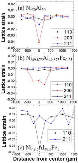 In Figure 2, the lattice strain of the (110), (200), and (211) were shown as legends of squares (), circles (), and triangles (), respectively. Since the mappings were a little off the indented centers as observed in Figure 1b, three representative lines across the indented centers, which display significant compressive strains were presented in Figure 2. The sizes of compressive lattice-strain distributions of both Ni50Al50 in Figure 2a and Ni49.5Al49.5Fe1 in Figure 2c were smaller than that of Ni49.875Al49.875Fe0.25 in Figure 2b. The compressive residual strain distribution of Ni49.875Al49.875Fe0.25 was about 1250 μm wide (from −500 to 750 μm). The compressive region of Ni50Al50 was about 500 and that of Ni49.5Al49.5Fe1 was about 480 μm wide. Additionally, the maximum compressive strain near the indented center of the Ni50Al50 and Ni49.875Al49.875Fe0.25 was found at the (200) plane, while that of the Ni49.5Al49.5Fe1 was detected at the (211) plane. To further discuss the aforementioned indentation results, Kramer et al.’s [26] theoretical model of the plastic zone size was recalled, considering the indentation load, yield strength, and zone size. The greater plastic-zone size and the smaller compressive strain indicated that the plasticity of Ni49.875Al49.875Fe0.25 was better than Ni50Al50 and Ni49.5Al49.5Fe1, consistent with Fine et al.’s prediction [5] and Ishida et al.’s results [2].