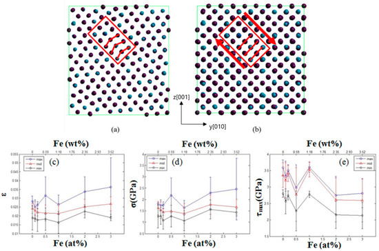 Figure 3. Molecular dynamics simulation results. The darker and light-colored symbols represent the Ni and Al atoms, respectively. (a) Lattice-misfit distortion before yielding; (b) distorted atoms shuffle to high-energy sites. The calculated parameters of minimum (), medium (Δ), and maximum () values at the yielding as a function of Fe-addition for (c) lattice strain; (d) local stress; and (e) τmax, respectively.