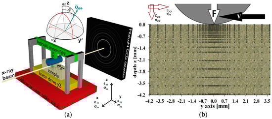 The material is in constant motion through the measurement region during the process, but the scan is finished before the boundary conditions of the outward edges can interfere with the stress fields. The sample is moved below the tool, and the resulting internal material loads are scanned as a function of the distance from the contact point. A total of 960 measurement positions were scanned in a region with dimensions of 7.8 mm in width and 3.65 mm in depth along the z direction, with a 50 µm ×50 µm beam size at 100 keV photon energy. The gauge volume for measurement is thus 50 µm × 50 µm × 2800 µm. Each measurement position has a 1-s measurement time consisting of 0.2 s collection duration and 0.8 s diffractometer movement and readout. The distribution of all scans and the sample coordinate system is shown in Figure 1b.