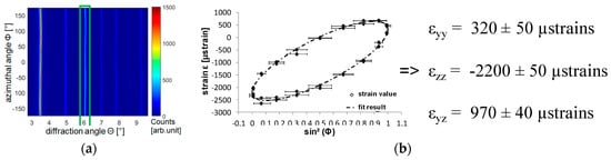 (a)Azimuthally integrated (caked) diffraction image of a single measurement point; (b) strain results from this diffraction image, fit to the measurement according to Equation (1).