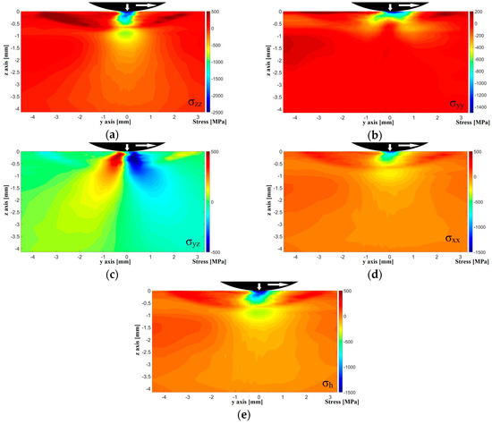 Shear stresses of the σyz component extend in 45° angles into the material in the loaded region, while the resulting residual stresses (at y = −4.15 mm) are almost zero. This can be attributed to the small amount of shear material flow in the surface region, which is rather small compared to the cutting processes with high shear forces, as found by Shet et al. [13]. The σxx and hydrostatic σh fields and distribution are calculated on the basis of the available stress components and are mainly dominated by the σzz component, which thus follow similar expansion into the material, as shown in Figure 3d,e. The stress fields show a high degree of symmetry to the contact point, which was also observed from indentation tests in the static condition, as found by Meyer et al. [6]. However, the interaction of loading stresses with the residual stresses and the material build-up in front of the roller lead to a slight asymmetry, which is less noticeable for σzz and σyz components and can be seen in the leading region and residual stress of the σyy component.