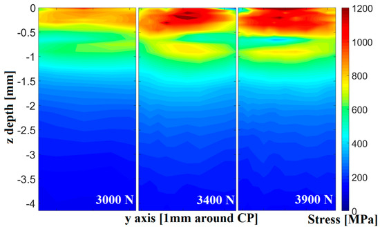 In comparison, for the region of depth up to 1 mm, where residual stresses were detected, the σzz component decreases from −2500MPa to −800 MPa compressive stresses, while the component ranges from a maximum of −1400 MPa to a local minimum directly under the contact point at −100 MPa. The stress component σy, showing compressive residual stresses, is the component generally measured ex situ with standard methods and is connected to increased fatigue properties of processed parts, as found by Kloos et al. [12]. Therefore, further analysis of this stress component depending on the applied contact forces will follow in Section 5.1.