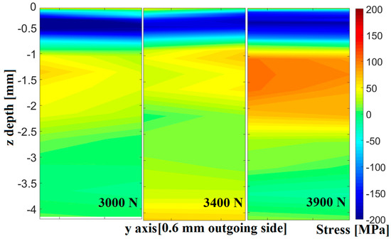 The triaxial loading condition and the zone of plastic deformation of the surface near region can be analyzed based on the calculation of the von Mises equivalent stress with the stress components determined in Section 4.1, as used in finite element method (FEM) simulation by Kuznetsov et al. [11] for burnishing processes. To analyze the influence of different contact parameters on the loading stress and the resulting residual stress field, three different contact forces of the same geometry were realized at 3000 N, 3400 N, and 3900 N. To display and the effect of the plastic deformation, the equivalent von Mises stress σeq was calculated from the determined stress components and the fields in a region of around 1 mm for the CP and outgoing material state were compared for the σyy component. As seen in the equivalent stress field and the outgoing deformed material state, as the loading force increases, both higher amounts and extended distribution of the loading stress were found under the contact point (Figure 4). The highest equivalent stress values below the contact point for each contact force tended to plateau at a value of around 1050 MPa, corresponding to around ~73% of the yield strength for this material state. Comparatively, the generated residual stress distributions in Figure 5, which were taken from enlarged views of the region at −4.5 mm to −3.5 mm in Figure 2b for different contact forces, showed an increase in depth and in the amount of introduced compressive stresses in the σyy component in the surface zone as well as in increase in the counterbalancing tensile residual stresses in the deeper region, which is consistent with the ex situ measurement of residual stresses for different contact forces by Meyer et al. [2]. However, compared to the loading state, there was only small improvement since the stresses also tended to plateau at −200 MPa.