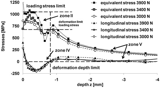 In the material below the loading stress limit needed for material modification, a zone of elastic stress distribution and compensating stresses in zone V can be identified, which reacts to the deep rolling process and its loading and residual stress field. At a greater depth, the rapid decrease of loading stress to values lower than the yield strength limits the expansion of the material modifications.