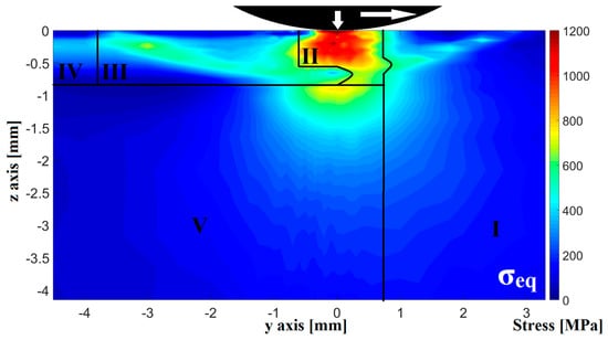 Equivalent stress field σeq divided into different zones during the deep rolling process with a material load ofF = 3900 N.