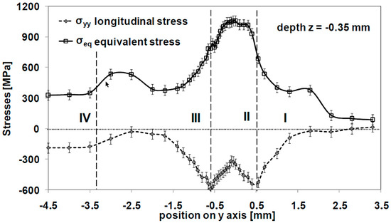It can also be observed that the residual stress in its superposition with the loading stress is not a simple addition for the loading stress and residual stress in zone III, when it is established in the material in zone II. In zone III, the measured stress state decreases to a minimum around −20 MPa, which is much higher than the residual stress state stabilizing at −200MPa at y= −4.5 mm. For the two peaks of the σyy component at the edges of zone II, it can be observed that there is only a slight difference after the residual stress has been introduced. This indicates load redistribution with other stress components, which can explain the asymmetric evolution of the equivalent stress value when comparing zones I (before) and III (after contact). Thus, the recalculation of pure loading stress is not possible by the subtraction of residual stresses in each component because of the stress redistribution between all stress components.