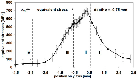 Additionally, concerning the stress evolution at z = −0.35 mm for the maximum residual stress of σyy below the surface, the equivalent stress development at a depth of −0.75 mm can be evaluated (see Figure 9), which corresponds to the position of sign change of the residual stress profile (Figure 6) in zone II towards zone V. This zone was defined as the limit between the plastically deformed material and the subsurface layer where compensation stresses are distributed to balance the “source stresses” of the upper layers. For this region, it can be observed that the equivalent stress increases and reaches a maximum shortly before the tool passes above the region, while after this point, the equivalent stress distribution continuously decreases. No plateau of equivalent stress is measured, as is visible in Figure 8. Since the distribution is assumed to be purely elastic, this evolution is seen as the loading stress sequence, acting during the process without the influence of residual stresses. Based on this, a separation of the theoretical loading stress distribution and the residual stress influence in the plastically deformed region might be achieved in further analyses, at least for this depth and lower.