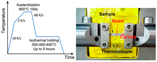 The steel was provided by ArcelorMittal Research and had a composition of 0.244% C, 2% Mn, and 1.57% Si (all in wt.%). The as-received state resulted from hot rolling and coiling, followed by isothermal heat treatment at 550 °C and by cold rolling. The studied thermal treatment, shown in Figure 1, was the final one consisting first of an austenitization at 950 °C for 100 s. Heating to the austenitization temperature was performed at a rate of 18 K·s−1 from room temperature to 600 °C, and at a rate of 2 K·s−1 from 600 °C to 950 °C. Austenitization holding was followed by a quench with an initial cooling rate of 80 K·s−1 to the isothermal holding temperatures. Three holding temperatures were investigated, namely, 350 °C, 400 °C, and 450 °C. Dilatometry experiments showed that the martensite-start temperature of this steel is about 370 °C. Samples for microstructure examinations were heat-treated in an instrumented dilatometer Bärh DIL 805, using the same heat treatment as that of the in-situ experiments described below with the exception of the cooling rates, which were fixed at 100 K·s−1.