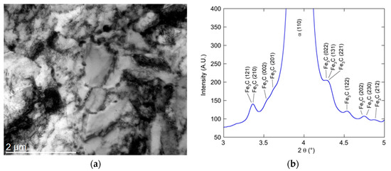 The initial state studied here consists of a material subjected to hot rolling, coiling, and then isothermal treatment at an intermediate temperature, which should leave the material close to an equilibrium microstructure. Figure 2a shows a bright-field micrograph, and Figure 2b a section of the HEXRD diffractogram around the (110) peak of ferrite. From these figures, it is possible to conclude that the alloy consists of ferrite and cementite particles, whose sizes are typically of the order of a few tens of nanometers. This initial microstructure is subsequently subjected to cold rolling before the austenitization heat treatment.
