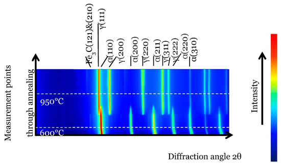 Stacking of 1D diffractograms during austenitization. The horizontal axis represents the diffraction angle 2θ and the vertical axis the annealing time. Two representative lines are drawn when the sample temperature reaches 600 °C and 900 °C.