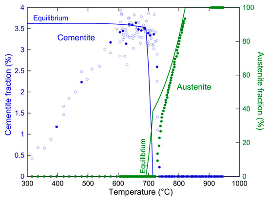 Evolution of Cementite fraction (determined by peak integration) and austenite fraction (determined by Rietveld refinement) during heating to the austenitization treatment. Open circles correspond to single measurements of cementite fraction, while full circles are averages of the open circles, made on five measurements.