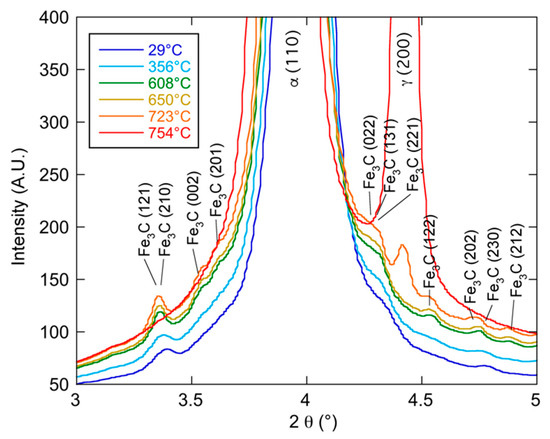 Initially, the austenite rapidly forms concurrently to the cementite dissolution, thereby absorbing the released carbon. When the cementite has fully dissolved, the austenite fraction is approximately 40% and then increases more slowly until full austenitization a little above 800 °C. When compared to the equilibrium, the evolution of cementite and austenite fractions is shifted by about 30 °C. This difference can be attributed to the presence of Mn in cementite, detected by TEM-EDS in agreement with the literature [29,30,31]. More surprising is the low fraction of cementite measured at the early stages of the austenitization treatment (below 600 °C). This is further illustrated in Figure 5, which shows a section of the diffractograms around the (110) peak of ferrite during heating. The cementite peaks are observed to first grow before disappearing. As it is likely that cementite is present in the as-cold rolled material, the most likely explanation is that the cementite particles from the initial microstructure are fragmented or deformed during cold rolling to a sufficiently small size that makes their detection by XRD difficult.