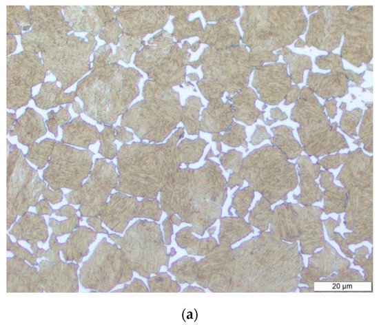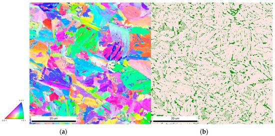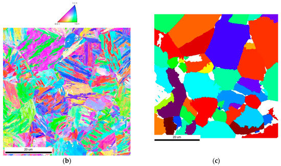 Secondly, the final microstructure after the bainitic transformation performed at 350 °C has been revealed by EBSD, as shown in Figure 6b. The bainite lath families are clearly visible. Due to the orientation relationships prevailing during the phase transformation, the orientation of former austenite grains can be obtained by inverse analysis. This evaluation has been realized using the ARPGE software [32] and results in a color map where different colors correspond to different former austenite grains (Figure 6c). Although the resulting micrograph corresponds to an area too small to be fully representative, it correlates well with the optical micrograph of Figure 6a, thus confirming the austenite grain size distribution.