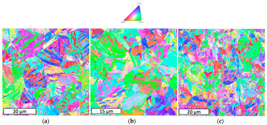 Figure 7 shows EBSD maps of the alloy when subjected to 1 h holding at the three temperatures. When the holding temperature increases, the bainitic transformation is observed to transition to a more granular form. However, the overall microstructure scale is quite similar at the three temperatures.