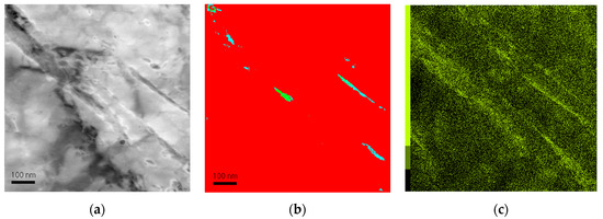 At a finer scale, TEM-ASTAR mapping also allows the phase distribution to be identified. Figure 9 shows a virtual bright-field map after annealing for 60 min at 450 °C. After such a long annealing at high temperature, it can be expected that little retained austenite is present, and that the carbon has been redistributed in carbides. The phase map (Figure 9b) shows that a small amount of austenite is still present, and that in other places, it has actually transformed to cementite. In both cases, austenite and cementite are present at lath boundaries. Additionally, EDS mapping has been performed in the same area, and the distribution of Mn is shown in Figure 9c. This map shows that the cementite formed by the decomposition of the retained austenite is rich in Mn.