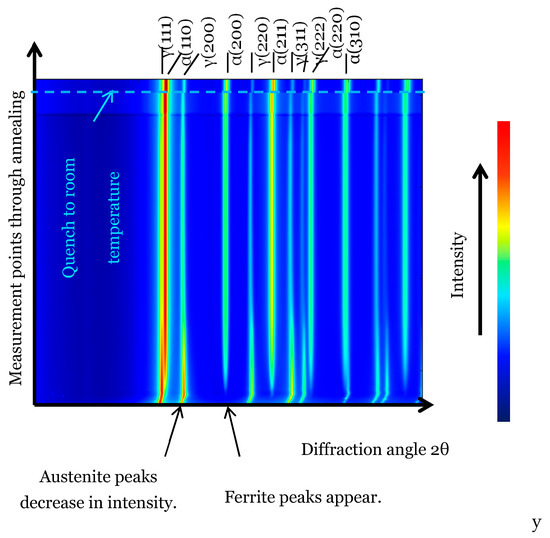 Stacking of HEXRD diffractograms during the quench from austenitization and subsequent annealing at 400 °C. The horizontal axis represents the diffraction angle 2θ and the vertical axis the annealing time.
