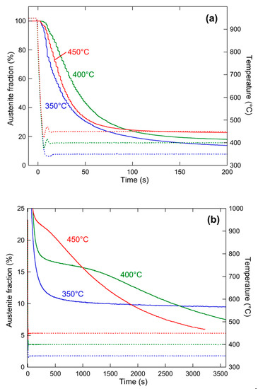The behavior at longer times is much more interesting. After about 2 min of holding, the material experiences a transformation stasis at all three temperatures. The higher the temperature, the higher the austenite fraction at the stasis, and the shorter the duration of the stasis. Namely, at 350 °C, the material stabilizes at an austenite fraction of 10% for the complete transformation time investigated, while at 450 °C, the stasis, which occurs at more than 20% austenite, lasts about 200 s before a drastic decrease in the austenite fraction (Figure 11b). Consequently, at short ageing times, the highest temperature presents the highest retained austenite, while at long ageing times, the reverse is observed.
