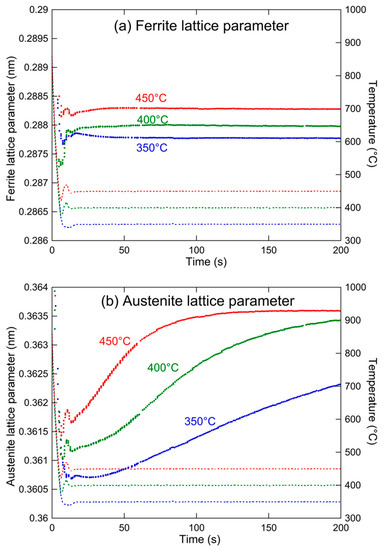 The lattice parameters of ferrite and austenite during the holding treatments at the three temperatures, as determined by FullProf fitting of the HEXRD diffractograms, are shown in Figure 12. As soon as the temperature is stabilized, the lattice parameter of ferrite is almost constant. This is a good indication that little supersaturation of carbon is present in bainite during the transformation. In the following, we will neglect the amount of carbon present in the ferritic phase. The evolution of the lattice parameter of austenite is much more pronounced, with a strong increase during the early holding times, indicating that the carbon content of austenite is increasing at this stage.