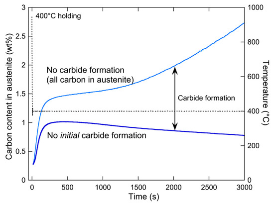 Evolution of the carbon content in austenite under the hypothesis that no carbides are present at the beginning of the isothermal holding treatment at 400 °C (dark blue), and under the calculation of no carbides throughout the holding treatment, corresponding to all carbon within austenite (light blue). The difference between the two curves is used to monitor the carbon content out of austenite (and thus within carbides).