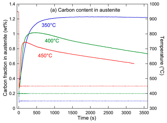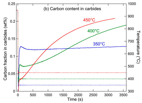 This parameter is also shown in Figure 12. By definition, it is equal to the former parameter at the start of holding (due to the hypothesis of the absence of carbides) and then progressively diverges. As expected, the largest divergence happens when the carbon content of austenite decreases, confirming that this decrease is related to the formation of carbides. The difference between the two curves of Figure 13 is the carbon content present out of austenite, and therefore, within carbides. Following this parameter is of course of considerable interest.