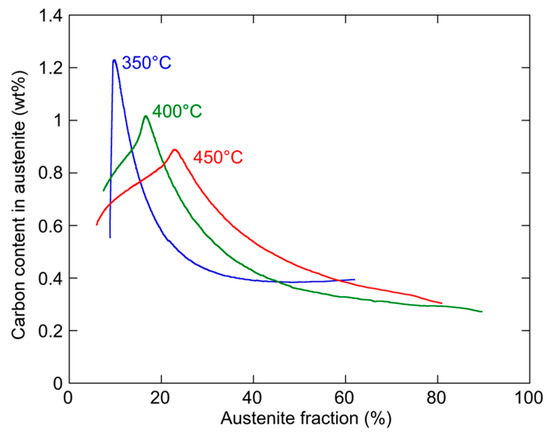 Evolution of the compromise between carbon content in austenite and austenite phase fraction during the three holding treatments at 350, 400, and 450 °C.